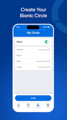 With the Bionic Circle App, up to 10 friends and family can remotely monitor you to see CGM values, meal announcements, and insulin doses and to receive alerts (Urgent Low / Urgent / Low Soon / Low / High / No Data).