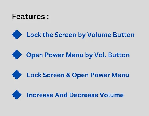 this app Uses BIND ACCESSIBILITY SERVICE permission to perform Global Actions like : 1 . Lock The Screen 2. Open System's Default power Menu 3 . monitor key events of volume button For Screen locking